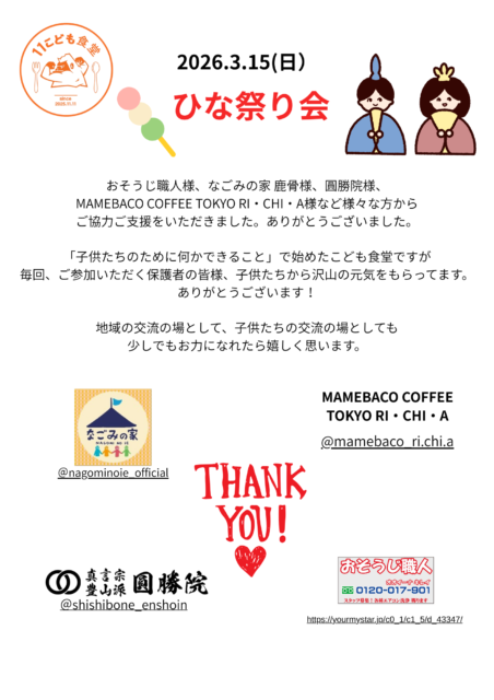 第4回目となる11こども食堂を3月15日【日】に開催しました。 今回も地域の方々や支援して頂いている企業・団体様に ご協力いただきました。ありがとうございました。 |